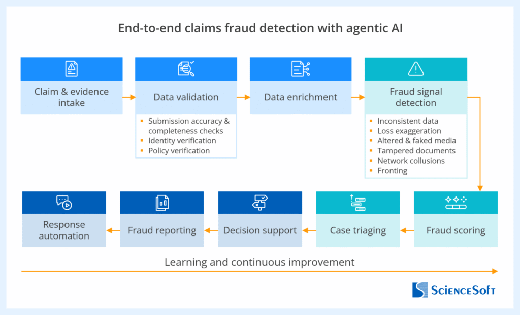 Most US carriers already have some traditional AI/ML in their stack to reliably score claims and send the riskiest ones to SIU. But despite impressive progress over rule-based tools, AI-enabled fraud detection systems remain largely reactive and manual. A typical high-risk case still demands hours, if not days, of manual orchestration — cross-checking and fusing scores across models, contacting claimants, scanning call notes, and compiling summaries for investigators. That human “glue” throttles throughput and extends fraud detection cycle time. ScienceSoft’s AI consultants believe that traditional AI/ML is effective as fraud decision support, but because it doesn’t act, the surrounding investigation friction persists.