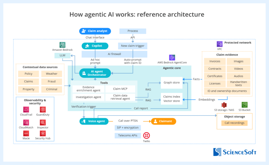 AI architects at ScienceSoft suggest that a pragmatic starting architecture for agentic claims fraud detection should include: